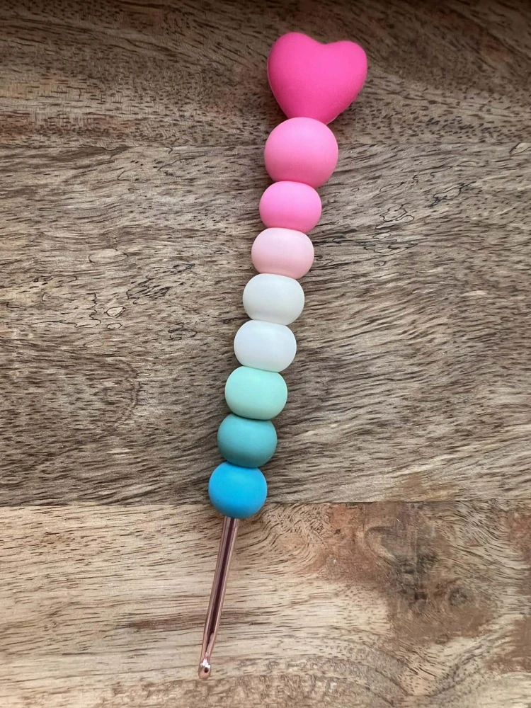 Designový háček s ergonomickou rukojetí s měkkými silikonovými korálky, které dodávají háčku nejen jedinečný vzhled, ale zajišťující také příjemný úchop a pohodlné háčkování.